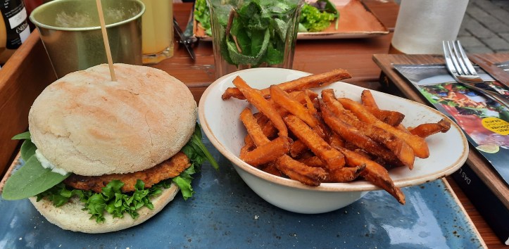Als meine Frau um 17 Uhr dazu kam gab es leckeren Burger mit Süßkartoffel- Fritten: