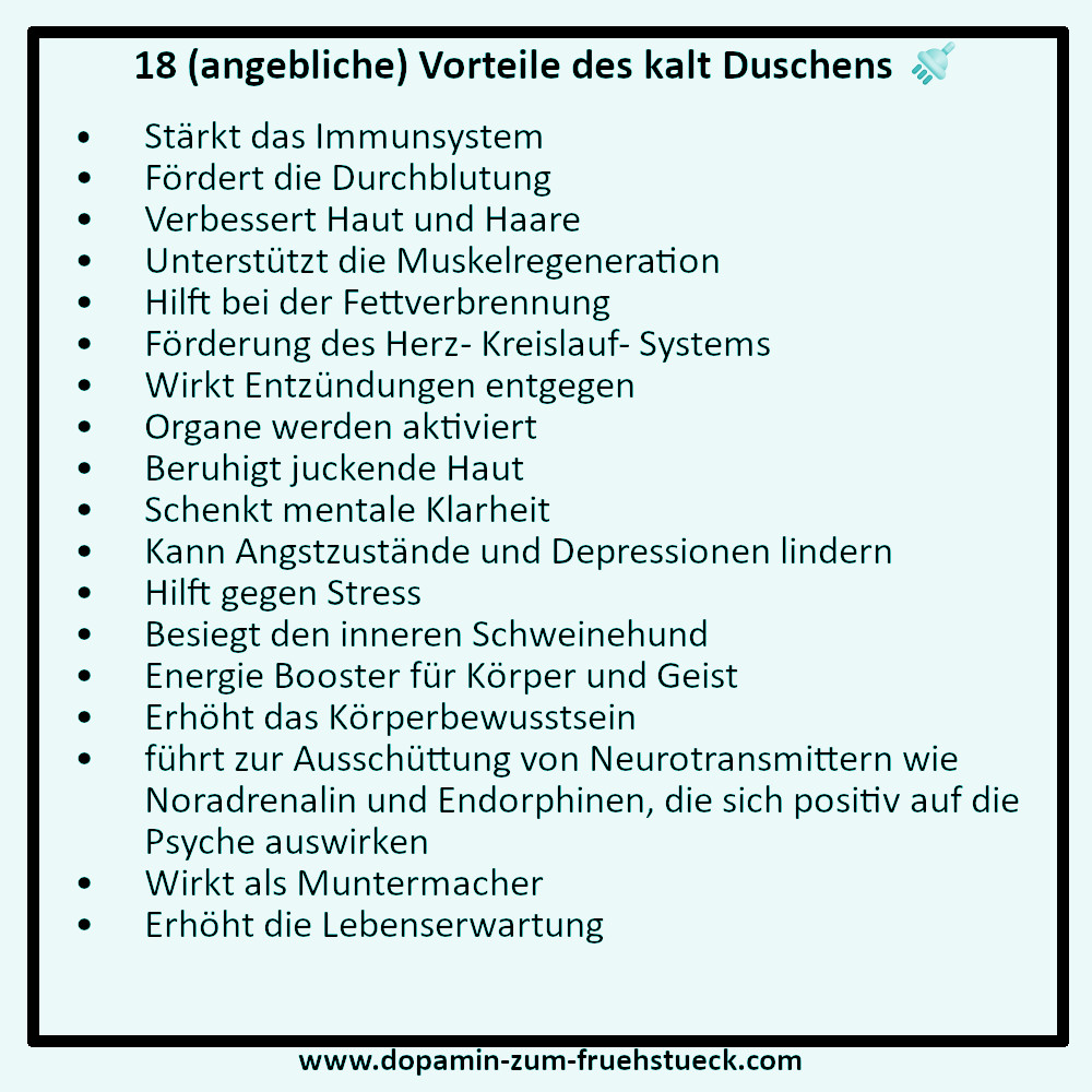 Für diesen Artikel habe ich es mir zur Aufgabe gemacht im Internet etwas zu recherchieren. Hier ist eine unvollständige Auswahl all der (angeblichen) Vorteile des kalt Duschens, die ich für diesen Artikel- Abschnitt recherchiert habe.
